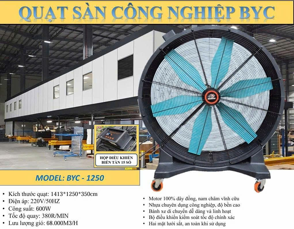 - Quạt công nghiệp di động BYC là loại quạt công nghiệp di động siêu lớn dành cho không gian rộng như: nhà kho, trang trại, xưởng sản xuất,...