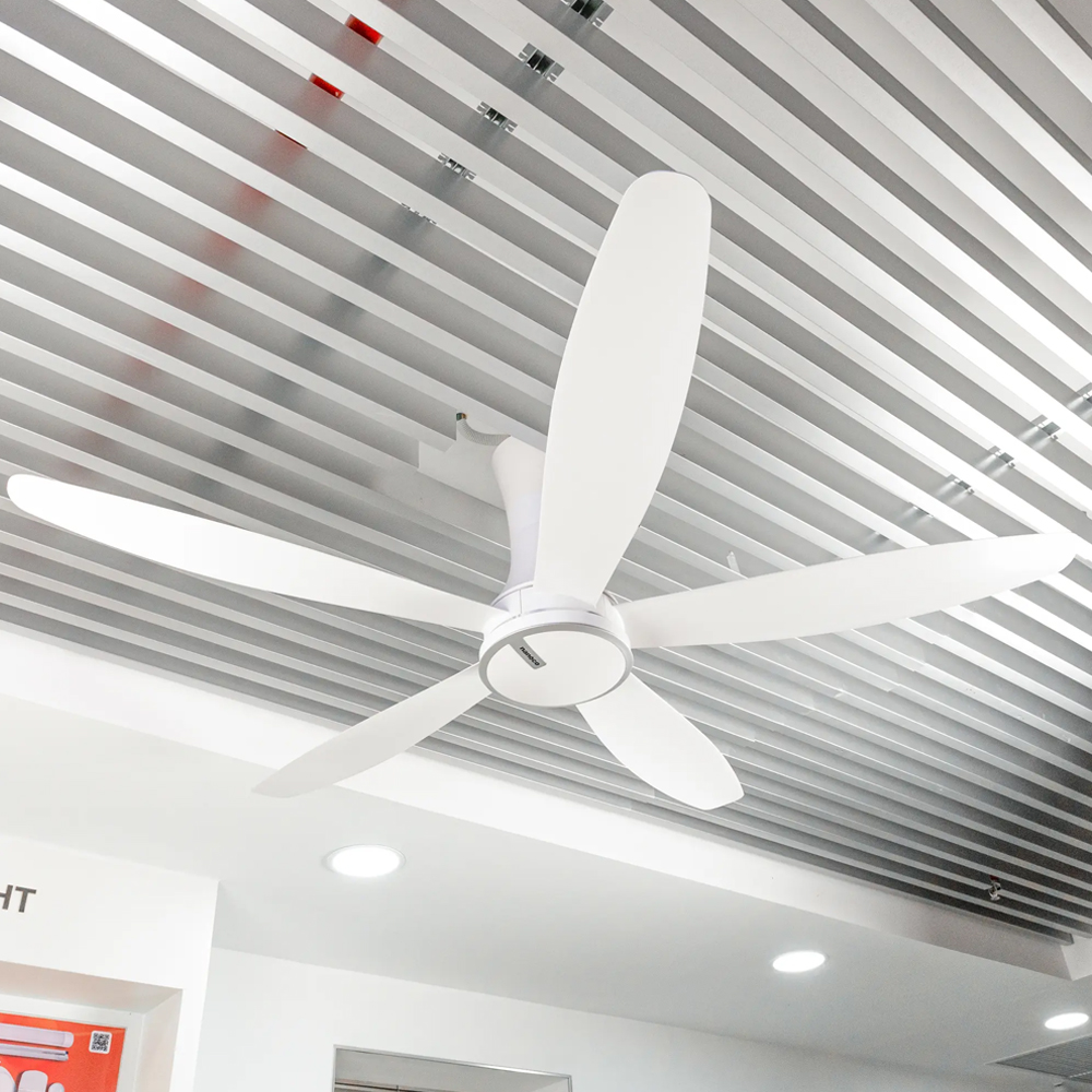 - Quạt trần DC sở hữu thiết kế hiện đại, vận hành êm và tối ưu luồng gió cho các không gian phòng khách, phòng ngủ hoặc căn hộ trần cao. Cánh quạt 150cm bằng chất liệu ABS-G cho độ bền tốt, trọng lượng nhẹ, giúp quạt quay ổn định và tạo gió rộng hơn.
